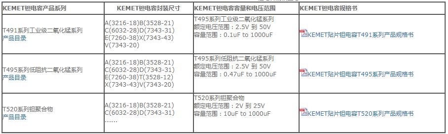 基美(KEMET)是貼片電容和鉭電容的生產(chǎn)商,基美鉭電容的銷售量位居全球第一,基美鉭電容由首字母“T”標(biāo)明,其后面為一個獨有的系列號,如;T491,T492,主要常用的系列有T491,T492,T494,T495,T496,T510,T520,T530等。每個系列都表示一種共有的物理形式和封裝類型,以及同樣的尺寸范圍和在25℃、50%的相對濕度及一個大氣壓的標(biāo)準(zhǔn)條件下的某些特征。其中T491系列已經(jīng)增加了物種超薄外殼尺寸,R/2012-12,S/3216-12,T/3528-12,U/6032-15和V/7343-20。