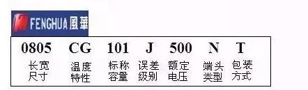 風(fēng)華電容額定電壓表示方法:風(fēng)華0805 CG 101 J 500 NT 如圖:第五部分為500為額定電壓;