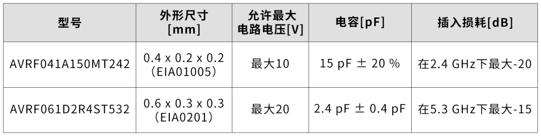 AVRF041A150MT242具有僅為0.4x0.2x0.2毫米的小尺寸,并提供ESD保護(hù)和2.4GHz頻段噪聲抑制。在2.4GHz下,最大插入損耗僅-20dB。AVRF061D2R4ST532的外形尺寸為0.6x0.3x0.3毫米,提供ESD保護(hù)和頻段高達(dá)5.3GHz的噪聲抑制。在該頻率下,插入損耗為-15dB。